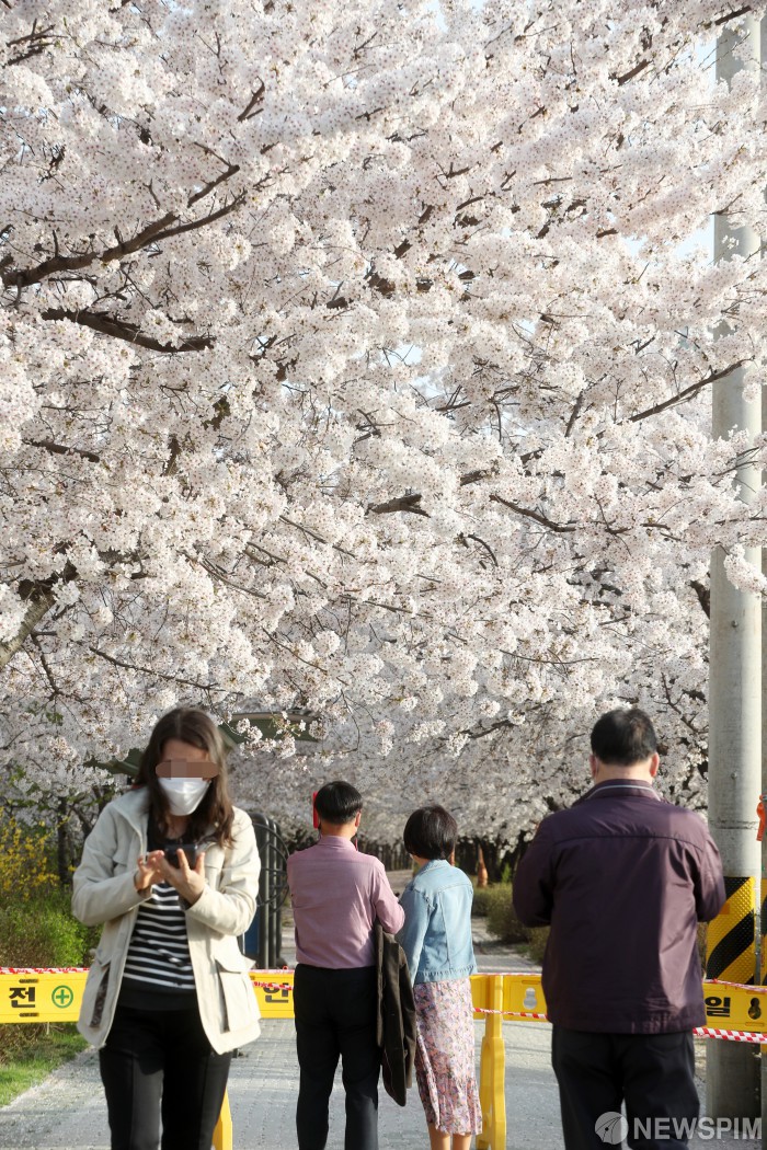 [서울=뉴스핌] 정일구 기자 = 서울 낮 기온이 20도 이상 오르며 완연한 봄 날씨를 보인 1일 오후 서울 영등포구 안양천 제방산책로에 벚꽃이 만개한 가운데 신종 코로나바이러스 감염증(코로나19) 확산 방지를 위해 출입이 통제되고 있다. 2021.04.01 mironj19@newspim.com