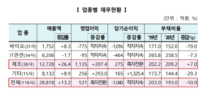 업종별로는 제조업의 실적 성과가 좋았다. IT 34개사(전체의 28.8%)의 매출은 1조2728억원으로 전년대비 26% 증가했고, 영업이익은 전년대비 207% 늘어난 1135억원을 기록했다. 당기순이익은 적자에서 흑자로 전환됐다.