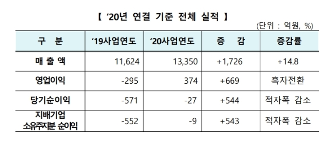 총 매출액은 1조3350억원으로 전년 대비 14.8% 증가했고, 영업이익은 총 374억원으로 전년대비 흑자전환 했다. 당기순이익은 27억원 순손실을 기록해 전년대비(571억원 적자) 적자폭이 대폭 감소했다.
