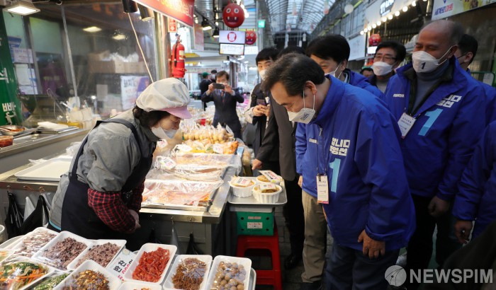[서울=뉴스핌] 최상수 기자 = 이낙연 더불어민주당 상임선대위원장이 4일 서울 도봉구 방학동 도깨비시장을 방문, 시장을 돌며 박영선 후보 지지를 호소하고 있다. 2021.04.04 kilroy023@newspim.com
