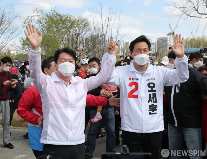 [서울=뉴스핌] 최상수 기자 = 오세훈 국민의힘 서울시장 후보(오른쪽)와 안철수 공동선거대책위원장(왼쪽)이 4일 오후 서울 서초구 세빛둥둥섬 앞에서 선거 유세에 나서고 있다. 2021.04.04 kilroy023@newspim.com