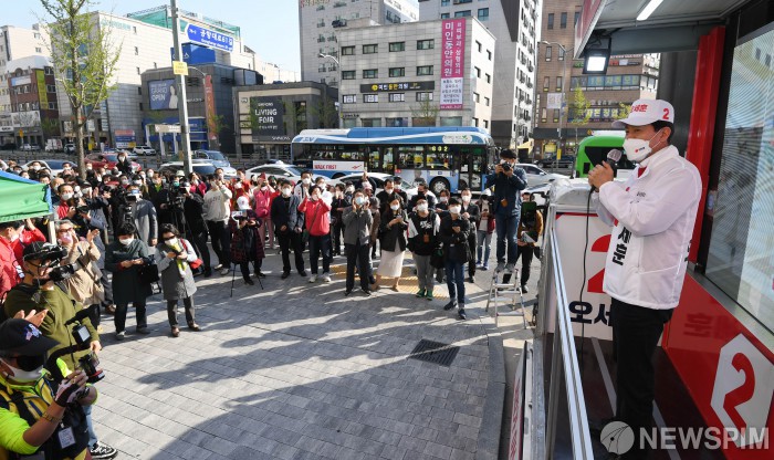 [서울=뉴스핌] 국회사진취재단 = 오세훈 국민의힘 서울시장 후보가 5일 오후 서울 강서구 등촌역 인근에서 연설하며 지지를 호소하고 있다. 2021.04.05 photo@newspim.com