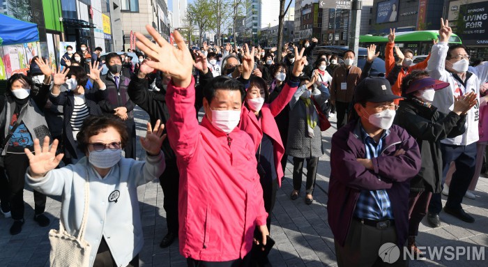 [서울=뉴스핌] 국회사진취재단 = 시민들이 5일 오후 서울 강서구 등촌역 인근에서 오세훈 국민의힘 서울시장 후보의 연설을 경청하며 환호하고 있다. 2021.04.05 photo@newspim.com