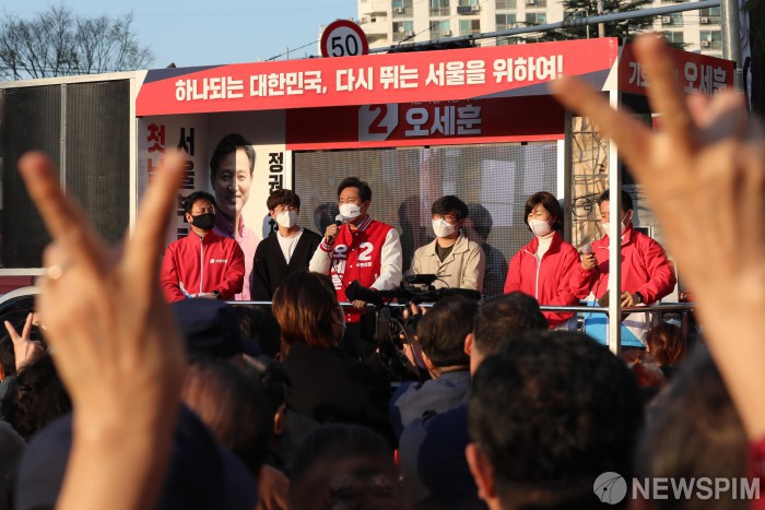[서울=뉴스핌] 국회사진취재단 = 오세훈 국민의힘 서울시장 후보가 5일 서울 동작구 장승배기역 앞에서 유세차량에 올라 지지를 호소하고 있다. 2021.04.05 photo@newspim.com