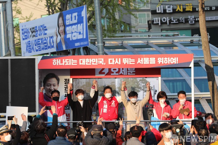[서울=뉴스핌] 국회사진취재단 = 오세훈 국민의힘 서울시장 후보가 5일 서울 동작구 장승배기역 앞에서 유세차량에 올라 지지를 호소하고 있다. 2021.04.05 photo@newspim.com