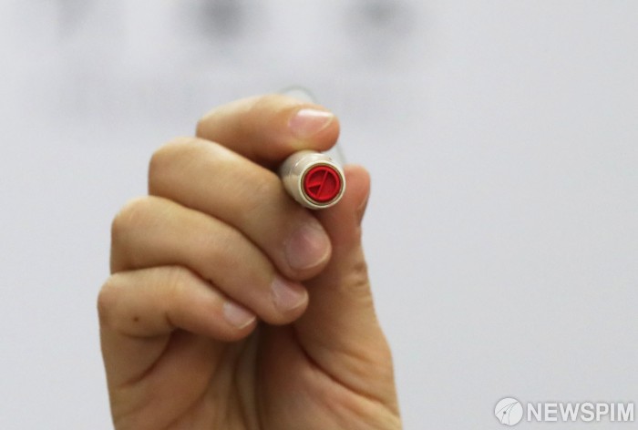 [서울=뉴스핌] 정일구 기자 = 서울시장 보궐선거를 하루 앞둔 6일 오후 서울 중구 장충동주민센터에 마련된 투표소에서 선거관리위원회 관계자가 투표소 설치 작업을 하던 중 기표 도장을 점검하고 있다. 2021.04.06 mironj19@newspim.com