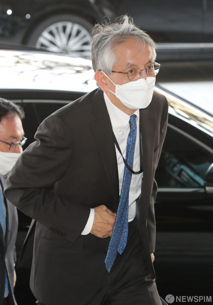 [서울=뉴스핌] 김학선 기자 = 아이보시 코이치 주한 일본대사가 7일 오후 홍남기 경제부총리 겸 기획재정부 장관과 면담하기 위해 서울 종로구 정부서울청사에 도착하고 있다. 2021.04.07 yooksa@newspim.com