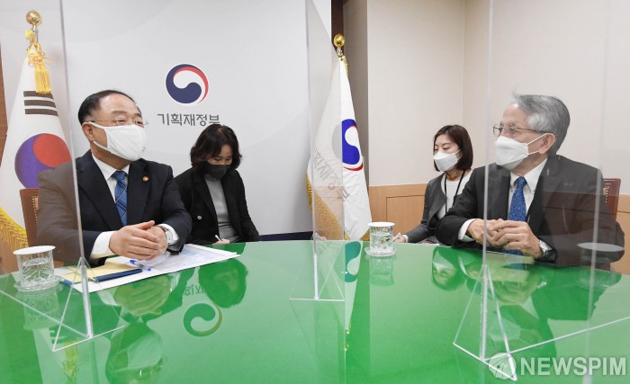 [서울=뉴스핌] 홍남기 경제부총리 겸 기획재정부 장관이 7일 오후 서울 종로구 정부서울청사에서 아이보시 코이치 주한 일본대사와 면담하고 있다. [사진=기획재정부] 2021.04.07 photo@newspim.com