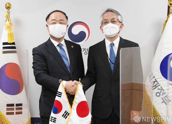 [서울=뉴스핌] 홍남기 경제부총리 겸 기획재정부 장관이 7일 오후 서울 종로구 정부서울청사에서 아이보시 코이치 주한 일본대사와 면담에 앞서 악수하고 있다. [사진=기획재정부] 2021.04.07 photo@newspim.com