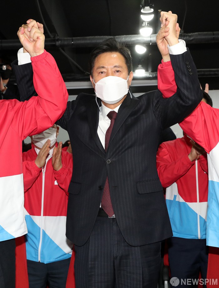 [서울=뉴스핌] 국회사진취재단 = 오세훈 국민의힘 서울시장 후보가 7일 오후 서울 여의도 국민의힘 중앙당사에 마련된 개표상황실에서 4·7재보선 출구조사 결과를 바라보며 두손을 들어 환호하고 있다. 2021.04.07 photo@newspim.com