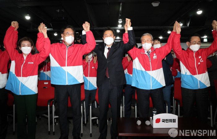 [서울=뉴스핌] 국회사진취재단 = 오세훈 국민의힘 서울시장 후보와 김종인 국민의힘 비상대책위원장이 7일 오후 서울 여의도 국민의힘 중앙당사에 마련된 개표상황실에서 4·7재보선 출구조사 결과를 바라보며 두손을 들어 환호하고 있다. 2021.04.07 photo@newspim.com
