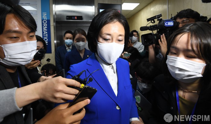 [서울=뉴스핌] 최상수 기자 = 더불어민주당 박영선 서울시장 후보가 7일 서울 여의도 중앙당사 1층에서 입장 발표를 한 뒤 굳은 표정으로 당사를 떠나고 있다. 박 후보는 당사에서 지도부 면담을 마친 뒤 개표상황실에는 들리지 않았다.