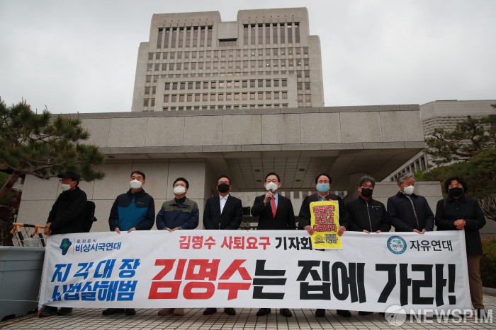 [서울=뉴스핌] 국회사진취재단 = 주호영 국민의힘 대표 권한대행이 13일 오전 서울 서초구 대법원 정문 앞에서 자유연대 주최 김명수 대법원장 사퇴 요구 기자회견에 참석해 발언을 하고 있다. 2021.04.13 photo@newspim.com