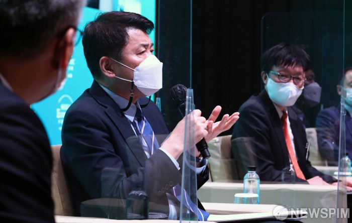 [서울=뉴스핌] 백인혁 기자 = 김준형 국립외교원장이 13일 오전 서울 여의도 페어몬트호텔 그랜드볼룸에서 열린 제9회 서울이코노믹포럼 패널토론에서 발언하고 있다. 2021.04.13 dlsgur9757@newspim.com