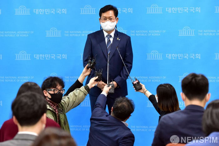 [서울=뉴스핌] 이형석 기자 = 송영길 더불어민주당 의원이 15일 오후 국회 소통관에서 당 대표 출마선언 기자회견을 마치고 취재진의 질문을 받고 있다. 2021.04.15 leehs@newspim.com