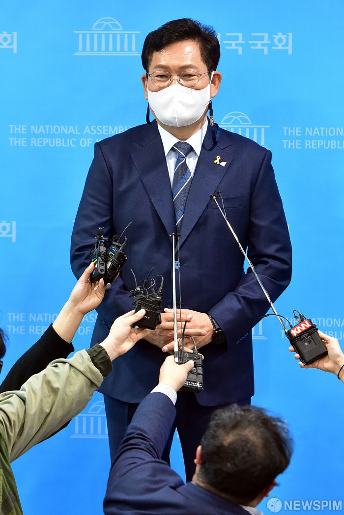 [서울=뉴스핌] 이형석 기자 = 송영길 더불어민주당 의원이 15일 오후 국회 소통관에서 당 대표 출마선언 기자회견을 마치고 취재진의 질문을 받고 있다. 2021.04.15 leehs@newspim.com