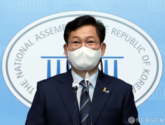 [서울=뉴스핌] 이형석 기자 = 송영길 더불어민주당 의원이 15일 오후 국회 소통관에서 당 대표 출마선언 기자회견을 하고 있다. 2021.04.15 leehs@newspim.com