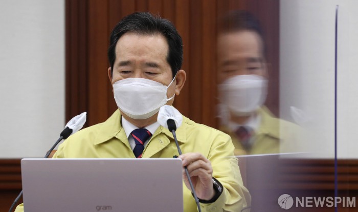 [서울=뉴스핌] 김학선 기자 = 정세균 국무총리가 16일 서울 종로구 정부서울청사에서 열린 신종 코로나바이러스 감염증(코로나19) 대응 중앙재난안전대책본부 회의를 주재하고 있다. 2021.04.16 yooksa@newspim.com