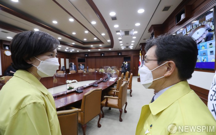 [서울=뉴스핌] 김학선 기자 = 유은혜 사회부총리 겸 교육부 장관과 권덕철 보건복지부 장관이 16일 서울 종로구 정부서울청사에서 열린 신종 코로나바이러스 감염증(코로나19) 대응 중앙재난안전대책본부 회의에 참석하며 대화하고 있다. 2021.04.16 yooksa@newspim.com