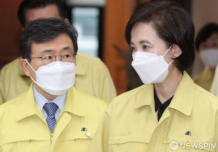 [서울=뉴스핌] 김학선 기자 = 유은혜 사회부총리 겸 교육부 장관과 권덕철 보건복지부 장관이 16일 서울 종로구 정부서울청사에서 열린 신종 코로나바이러스 감염증(코로나19) 대응 중앙재난안전대책본부 회의에 참석하며 대화하고 있다. 2021.04.16 yooksa@newspim.com