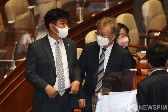 [서울=뉴스핌] 최상수 기자 = 권칠승 중소벤처기업부 장관(왼쪽 두번째)이 20일 서울 여의도 국회 본회의장에서 열린 경제 분야 대정부질문에 출석해 김병욱 더불어민주당 의원(왼쪽)과 대화를 나누고 있다. 2021.04.20 kilroy023@newspim.com