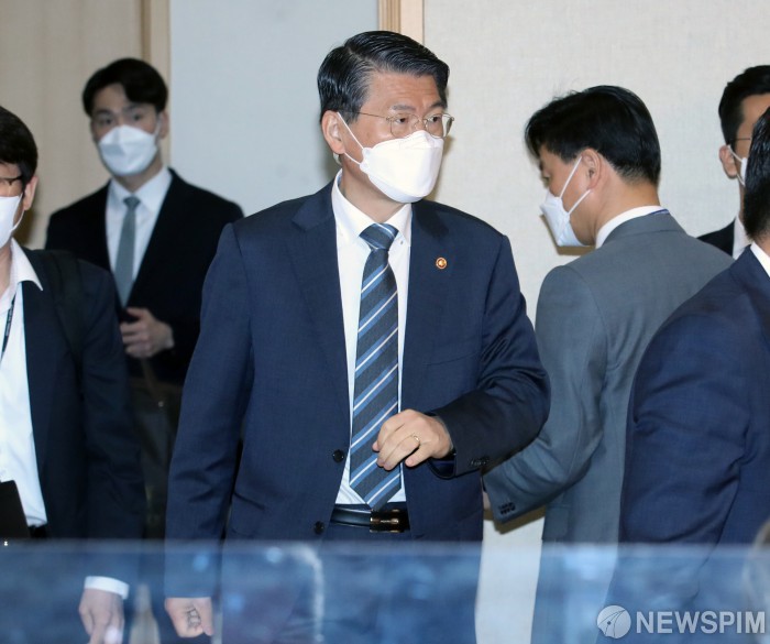 [서울=뉴스핌] 김학선 기자 = 은성수 금융위원장이 21일 서울 종로구 정부서울청사에서 열린 '제20차 부동산시장 점검 관계장관회의'에 참석하고 있다. 2021.04.21 yooksa@newspim.com