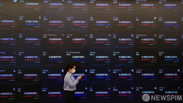 [서울=뉴스핌] 윤창빈 기자 = 21일 오후 서울 강남구 암호화폐 거래소 업비트 라운지 전광판에 비트코인 가격이 표시되고 있다. 현지시간으로 오늘(20일) 미국 가상화폐 시세정보 사이트 코인마켓캡에서 도지코인은 전일 대비 0.0743달러(18.65%) 급락한 0.3238달러에 거래되고 있다. 최근 8,000만원을 돌파한 비트코인은 현재 7,000만원 선에서 등락을 하고 있다. 2021.04.21 pangbin@newspim.com