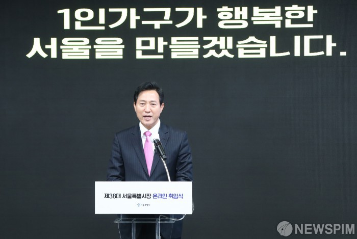 [서울=뉴스핌] 사진공동취재단 = 오세훈 시장이 22일 오전 서울 동대문구 동대문디자인플라자에서열린 온라인 취임식에서 추진 정책에 대해 설명하고 있다. 2021.04.22 photo@newspim.com