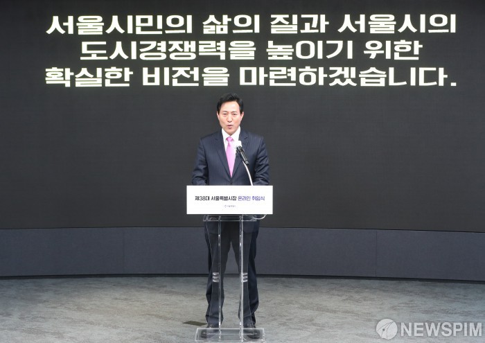 [서울=뉴스핌] 사진공동취재단 = 오세훈 시장이 22일 오전 서울 동대문구 동대문디자인플라자에서열린 온라인 취임식에서 추진 정책에 대해 설명하고 있다. 2021.04.22 photo@newspim.com