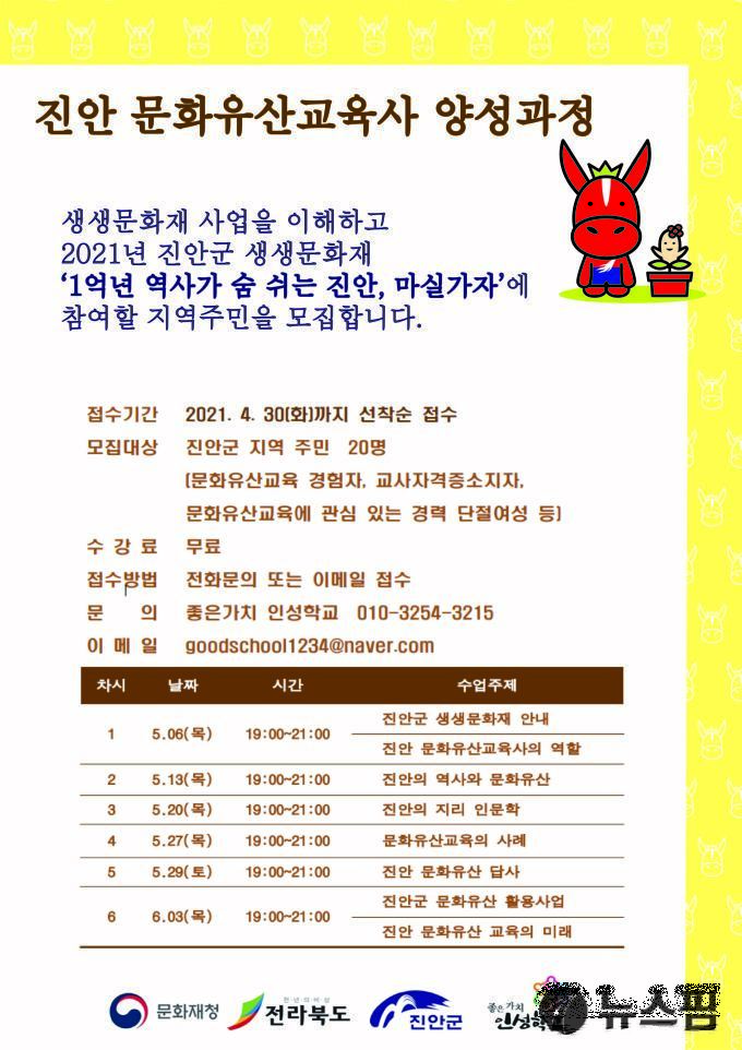 | 진안군 상생문화제 문화유산교육사 모집 포스터[사진=진안군]2021.04.23 lbs0964@newspim.com |