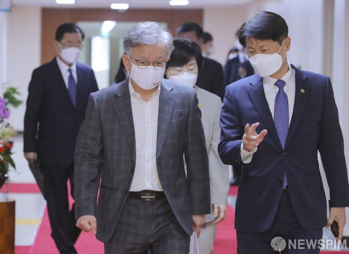 [서울=뉴스핌] 김학선 기자 = 권칠승 중소벤처기업부 장관(가운데)과 김강립 식약처장이 27일 서울 종로구 정부서울청사에서 열린 국무회의에 참석하고 있다. 2021.04.27 yooksa@newspim.com