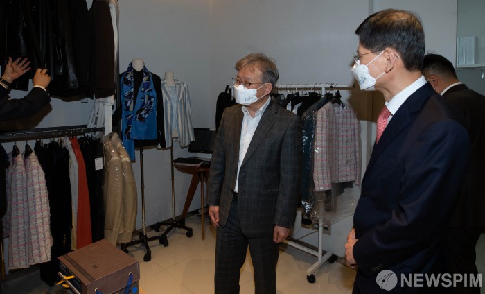 [서울=뉴스핌] 윤창빈 기자 = 권칠승 중소벤처기업부 장관(왼쪽)이 27일 오후 서울 강남구 바디프랜드 본사에서 열린 자상한 기업 업무협약식을 마치고 직원 복지 시설을 둘러보고 있다. 2021.04.27 pangbin@newspim.com
