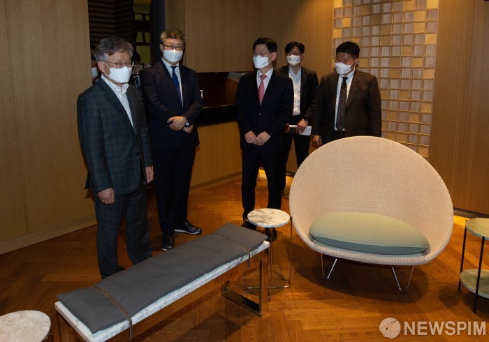[서울=뉴스핌] 윤창빈 기자 = 권칠승 중소벤처기업부 장관(왼쪽)이 27일 오후 서울 강남구 바디프랜드 본사에서 열린 자상한 기업 업무협약식을 마치고 직원 복지 시설을 둘러보고 있다. 2021.04.27 pangbin@newspim.com