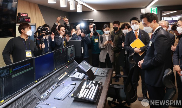 [서울=뉴스핌] 김학선 기자 = 오세훈 서울시장이 29일 오전 서울 종로구 삼일빌딩에 개관한 서울관광플라자를 찾아 온라인스튜디오에서 서울 관광 관련 방송시스템을 체험해 보고 있다. 2021.04.29 yooksa@newspim.com
