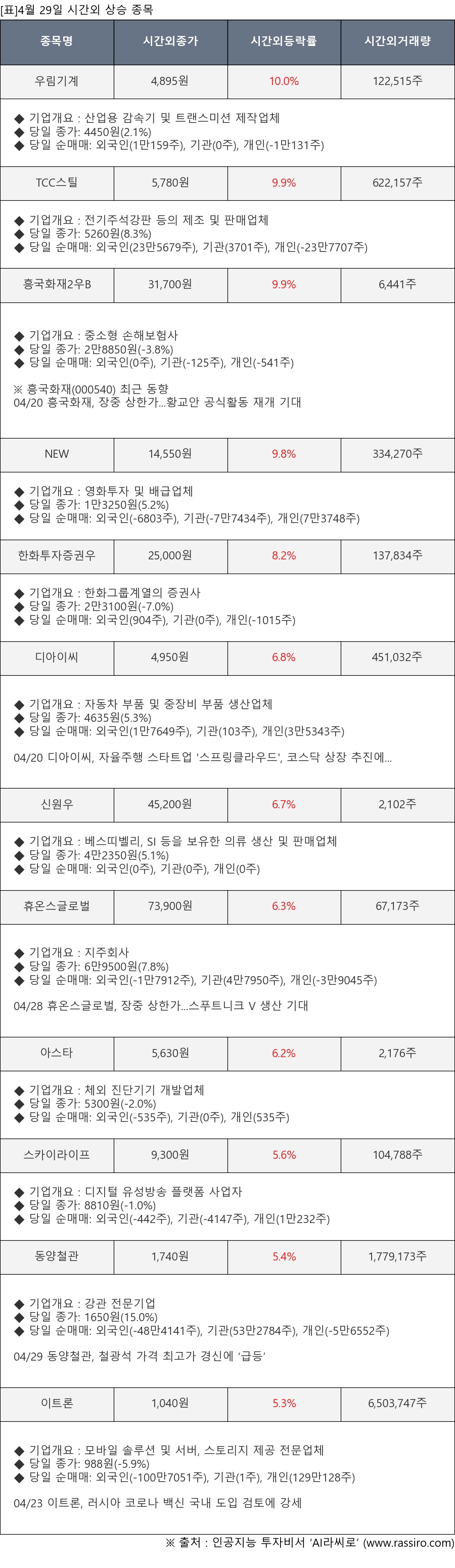 ※ 관련 종목: 우림기계, TCC스틸, 흥국화재2우B, NEW, 한화투자증권우, 디아이씨, 신원우, 휴온스글로벌, 아스타, 스카이라이프, 동양철관, 이트론