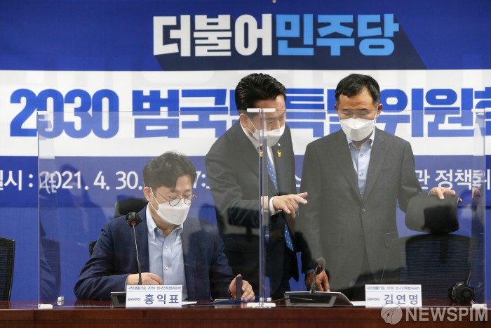 [서울=뉴스핌] 이형석 기자 = 홍익표 공동위원장(왼쪽부터), 고영인 간사(의원), 김연명 공동위원장(중앙대 교수)가 30일 국회 의원회관에서 열린 더불어민주당 국민생활기준 2030 범국민특별위원회 활동보고 간담회에서 의견을 나누고 있다. 2021.04.30 leehs@newspim.com