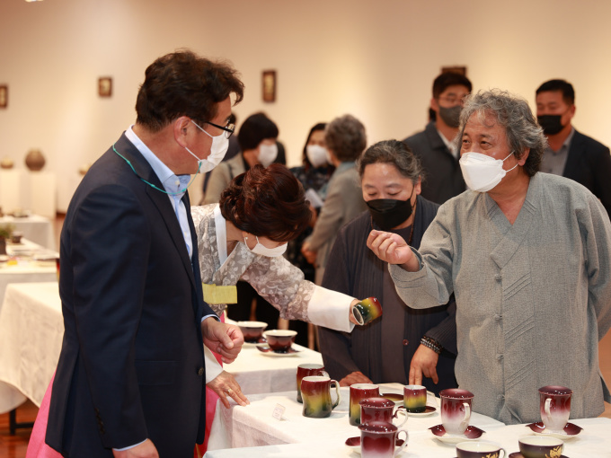 | 조민호 도예가(오른쪽)가 최명서 영월군수에게 전시된 도자기 작품을 설명하고 있다.[사진=영월군청] 2021.04.30 onemoregive@newspim.com |