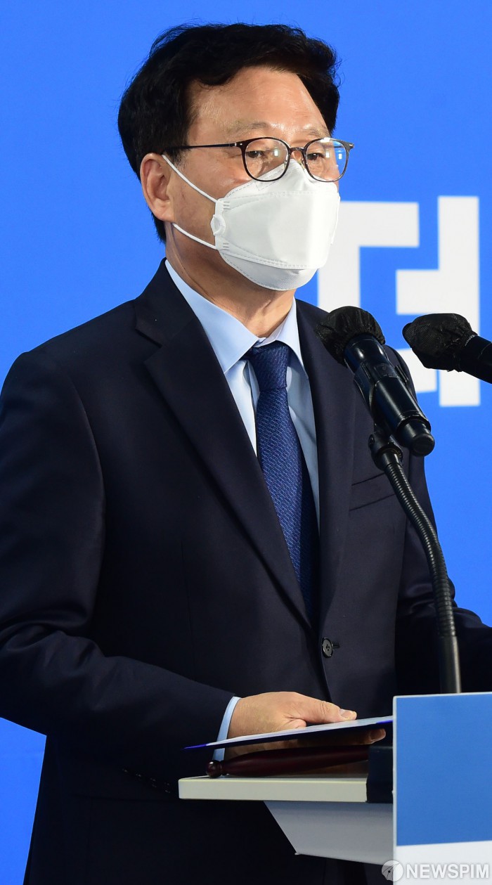 [서울=뉴스핌] 백인혁 기자 = 더불어민주당의 새 지도부를 선출하는 전당대회가 2일 오후 서울 여의도 중앙당사에서 열린 가운데 박광온 사무총장이 안건 설명을 하고 있다. 2021.05.02 dlsgur9757@newspim.com