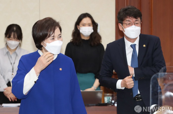 [서울=뉴스핌] 김학선 기자 = 유은혜 부총리 겸 교육부 장관과 류근관 통계청장이 4일 서울 종로구 정부서울청사에서 열린 사회관계장관회의에 참석하고 있다. 2021.05.04 yooksa@newspim.com