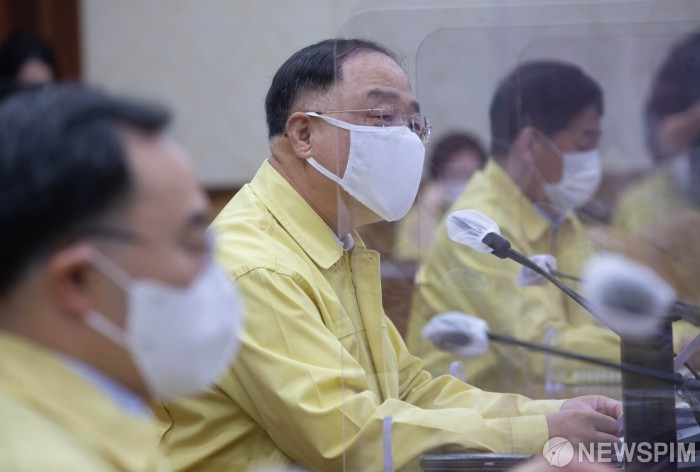 [서울=뉴스핌] 윤창빈 기자 = 홍남기 국무총리 직무대행이 9일 오후 서울 종로구 정부서울청사에서 열린 코로나19 대응 중앙재난안전대책본부 회의에서 모두발언을 하고있다. 2021.05.09 pangbin@newspim.com