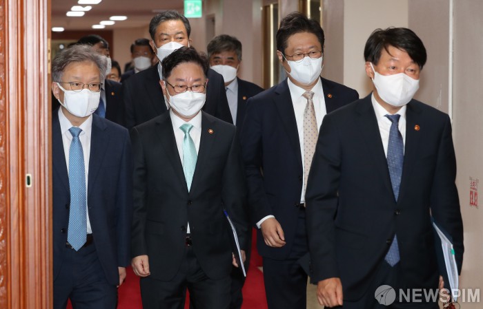 [서울=뉴스핌] 김학선 기자 = 권칠승 중소벤처기업부 장관(왼쪽부터), 박범계 법무부 장관, 황희 문화체육관광부 장관, 안경덕 고용노동부 장관이 11일 서울 종로구 정부서울청사에서 열린 국무회의에 참석하고 있다. 2021.05.11 yooksa@newspim.com