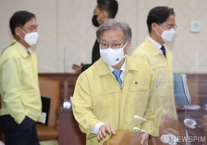 [서울=뉴스핌] 김학선 기자 = 권칠승 중소벤처기업부 장관이 12일 서울 종로구 정부서울청사에서 열린 비상경제 중앙대책본부 회의에 참석하고 있다. 2021.05.12 yooksa@newspim.com
