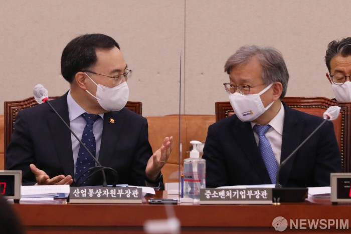 [서울=뉴스핌] 이형석 기자 = 문승욱 산업통상자원부 장관(왼쪽)과 권칠승 중소벤처기업부 장관이 13일 오전 서울 여의도 국회에서 열린 산업통상자원중소벤처기업위원회 전체회의에서 대화를 나누고 있다. 2021.05.13 leehs@newspim.com