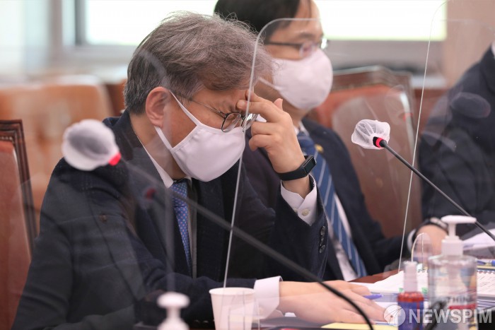 [서울=뉴스핌] 이형석 기자 = 권칠승 중소벤처기업부 장관이 13일 오전 서울 여의도 국회에서 열린 산업통상자원중소벤처기업위원회 전체회의에 참석해 생각에 잠겨 있다. 2021.05.13 leehs@newspim.com