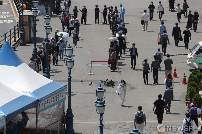 [서울=뉴스핌] 김학선 기자 = 신종 코로나바이러스 감염증(코로나19) 신규 확진자가 닷새 만에 700명대를 넘어서며 보름만에 최대 규모를 기록한 13일 서울역 광장에 마련된 임시 선별검사소에서 시민들이 코로나19 검사를 받기 위해 줄을 서서 기다리고 있다. 2021.05.13 yooksa@newspim.com