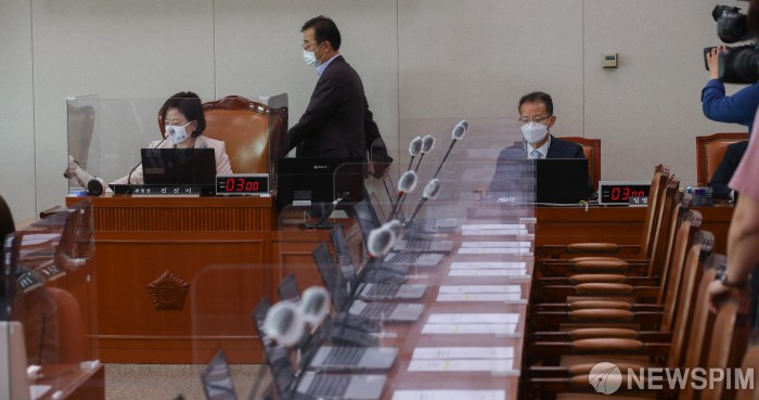 [서울=뉴스핌] 최상수 기자 = 13일 오후 서울 여의도 국회에서 열린 국토교통위원회 전체회의에서 진선미 위원장이 정회를 선포하고 있다. 이날 회의에 국민의힘 의원들은 불참하였다. 2021.05.13 kilroy023@newspim.com