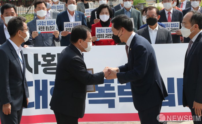 [서울=뉴스핌] 국회사진취재단 = 14일 서울 종로구 청와대 분수대 앞에서 열린 국민의힘 비상 의원총회에 앞서 김기현 당대표 권한대행 겸 원내대표가 유영민 대통령 비서실장에게 항의서한을 전달한 뒤 악수하고 있다. 국민의힘은 전날 국회 본회의에서 김부겸 총리 인준안을 민주당이 강행처리한 것에 항의하며 청와대 앞에서 비상의원총회를 열었다. 2021.05.14 photo@newspim.com