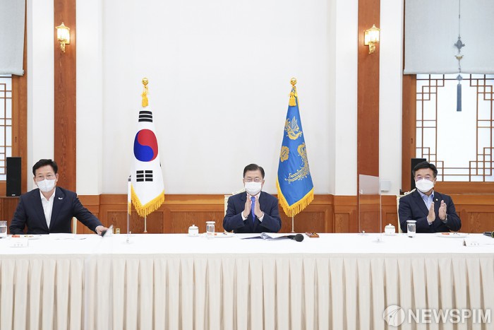 [서울=뉴스핌] 문재인 대통령이 14일 오전 청와대에서 열린 더불어민주당 지도부 초청 간담회에서 발언하고 있다. [사진=청와대] 2021.05.14 photo@newspim.com