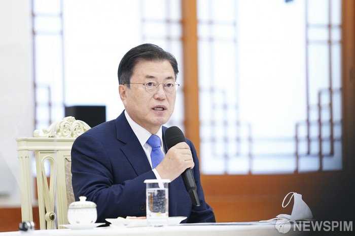 [서울=뉴스핌] 문재인 대통령이 14일 오전 청와대에서 열린 더불어민주당 지도부 초청 간담회에서 발언하고 있다. [사진=청와대] 2021.05.14 photo@newspim.com