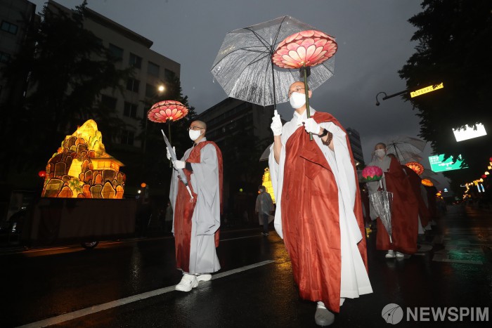 [서울=뉴스핌] 정일구 기자 = 부처님 오신 날을 앞둔 15일 오후 서울 종로구 조계사 일대에서 비가 내리는 가운데 연등 행렬이 이어지고 있다. 2021.05.15 mironj19@newspim.com